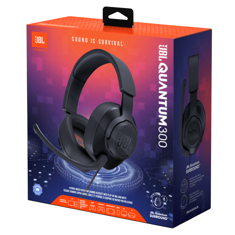 Step up your game with superior audio. JBL Quantum 300 wired headset creates a new level of immersion thanks to JBL QuantumSOUND Signature and accurate audio positioning. JBL QuantumSURROUND generates a realistic soundscape that drops you in the middle of the action, gives you an edge, and maximizes