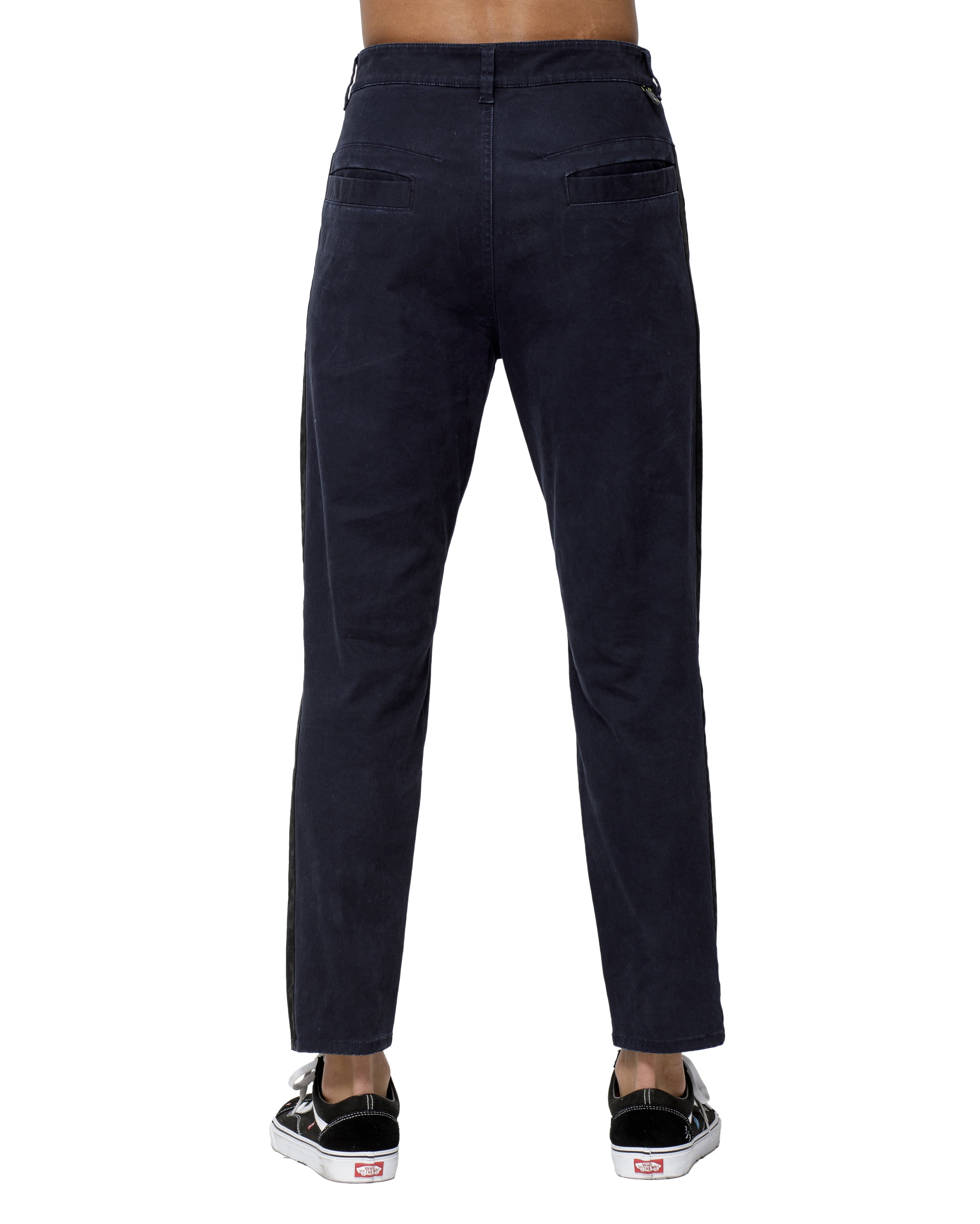 Cropped twill pants with contrast side panels.  Perfect for a casual weekend look, these contemporary cut trousers will have you looking sharp.