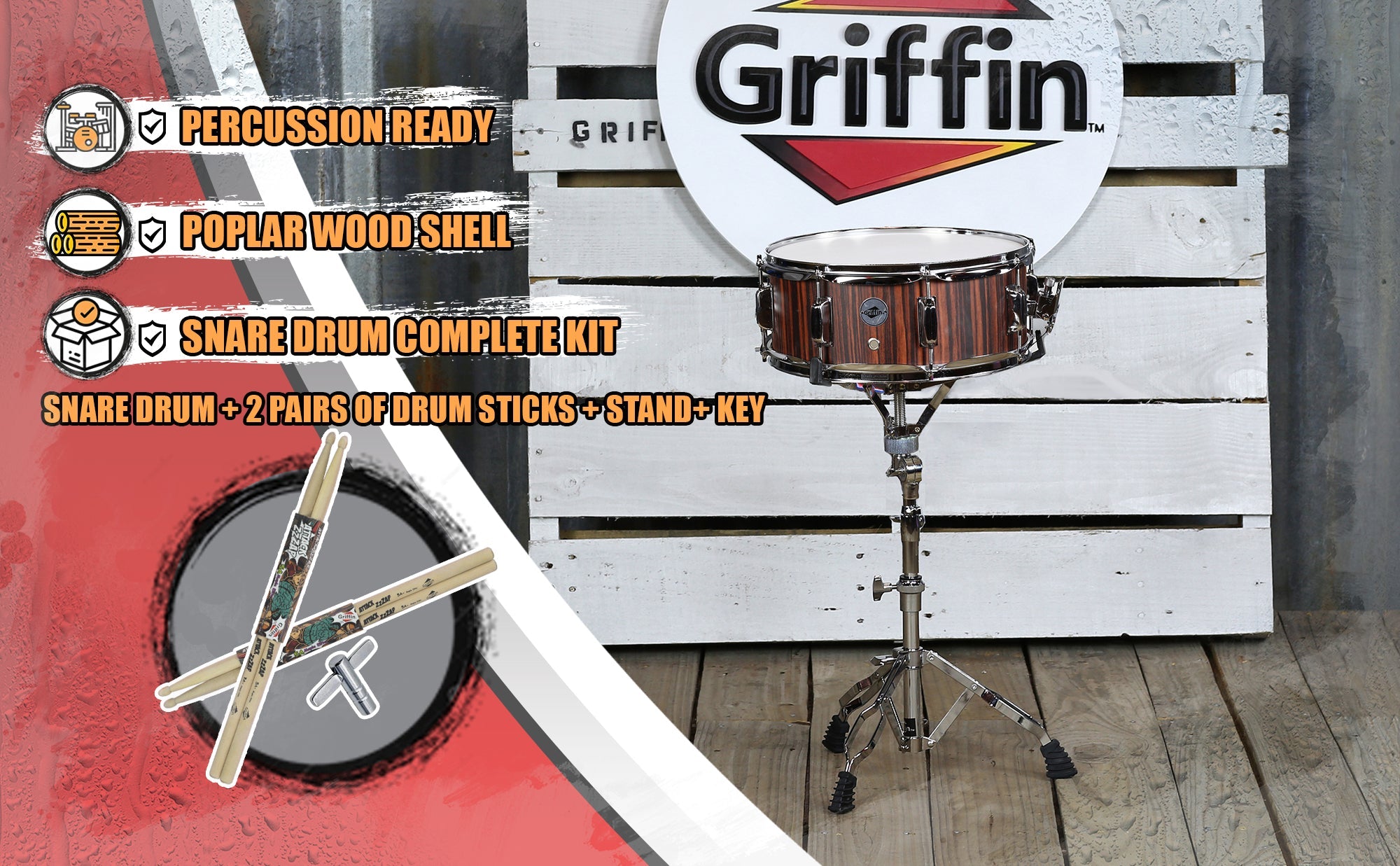- Complete Kit Includes: 1x Snare Drum, 1x Snare Drum Stand, 2x Pairs of Maple Drum Sticks, 1x Drum Key