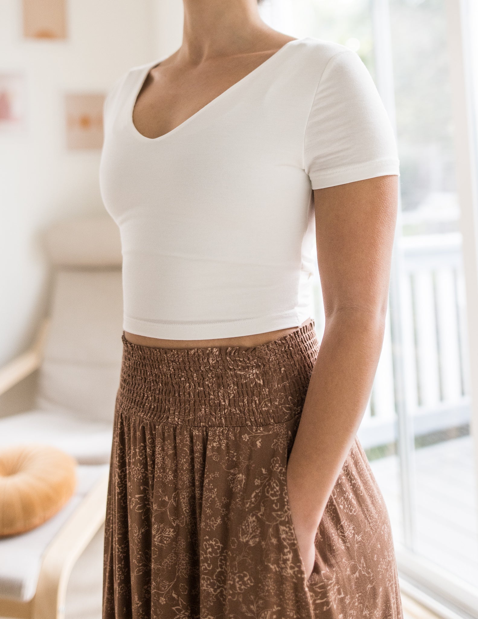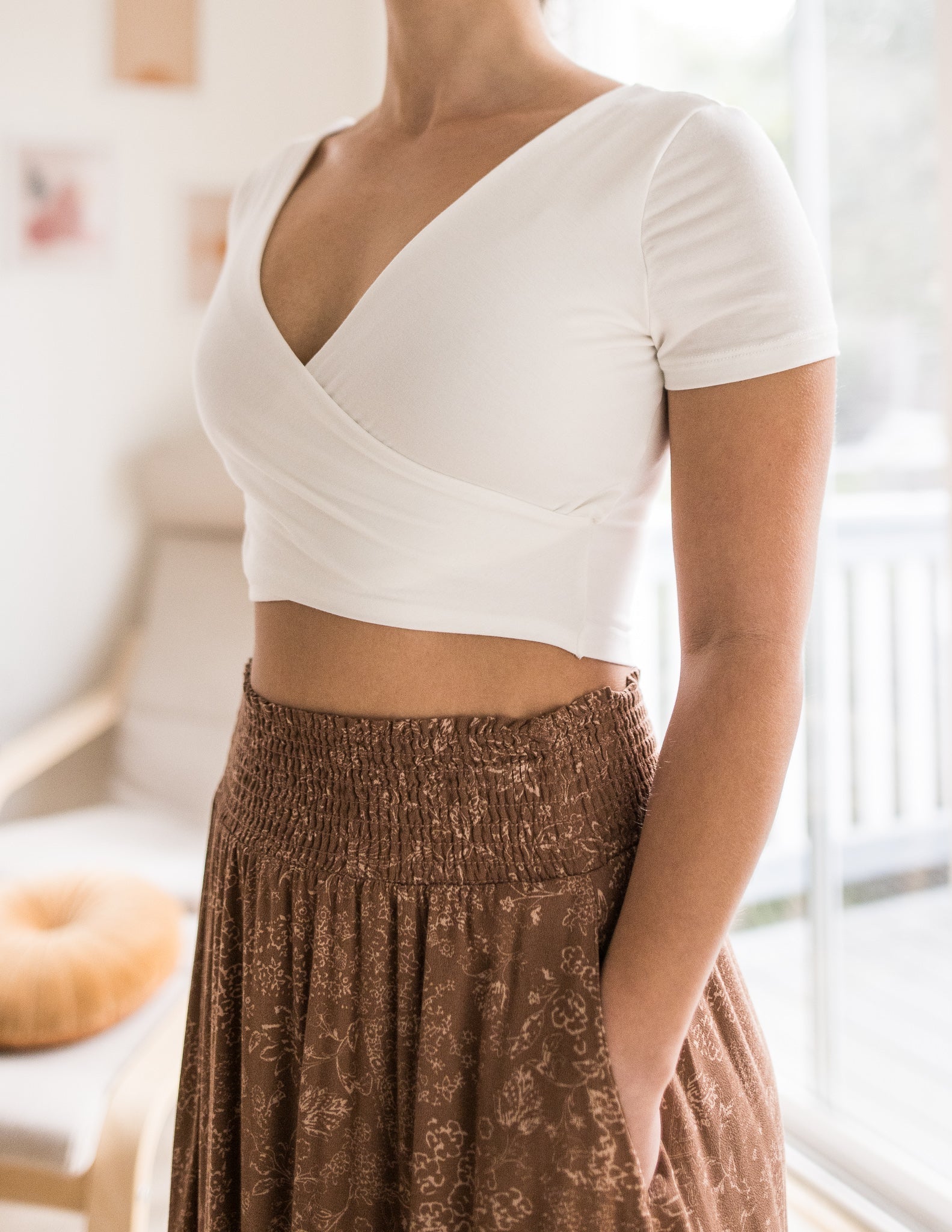 Luxuriously soft double-layered reversible crop top with overlapping criss-cross front (or back) and v-neck back (or front). * Inner layer is purposefully not sewn onto the bottom hem or side seams.
