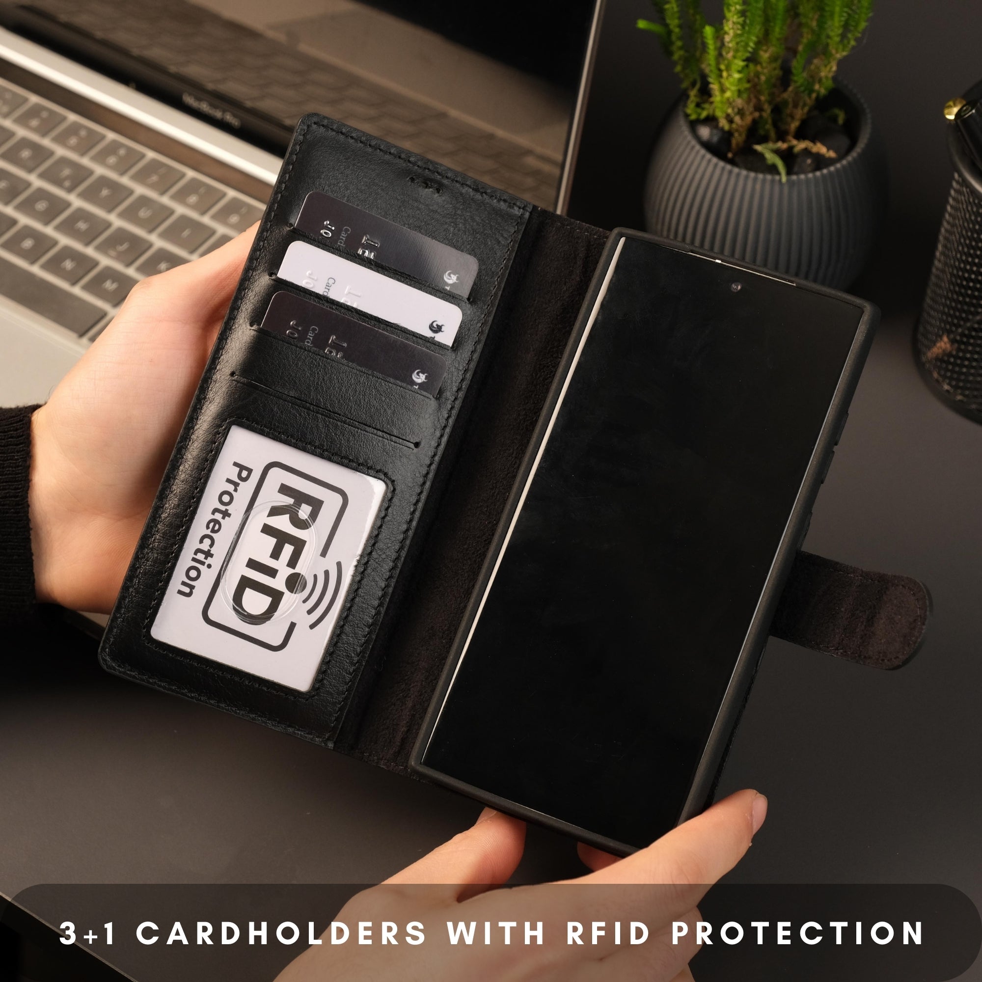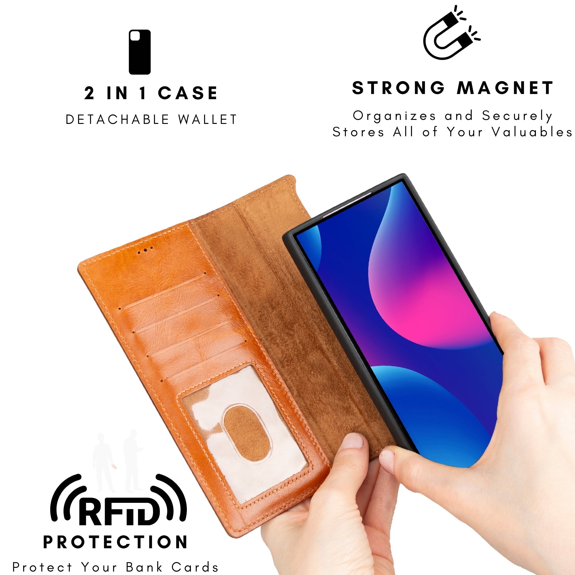 Enjoy sophistication with the TORONATA Buffalo leather wallet case for Samsung Galaxy S24 Ultra. This luxurious full-grain leather accessory blends design and utility. The magnetically removable case features a strong magnetic construction for safe holding and easy wireless charging. This leather wallet case organizes and secures your essentials with four card slots, an ID and driver's license window, and RFID protection. The plush suede interior, secret cash drawer, and hands-free kickstand improve comfort and convenience. Stay connected with subtle notification holes and indulge in TORONATA's leather workmanship. Enhance your Galaxy S24 Ultra experience today with elegance and protection. The S24 Ultra Wallet, leather case, RFID protection, and TORONATA are redefining style with quality.