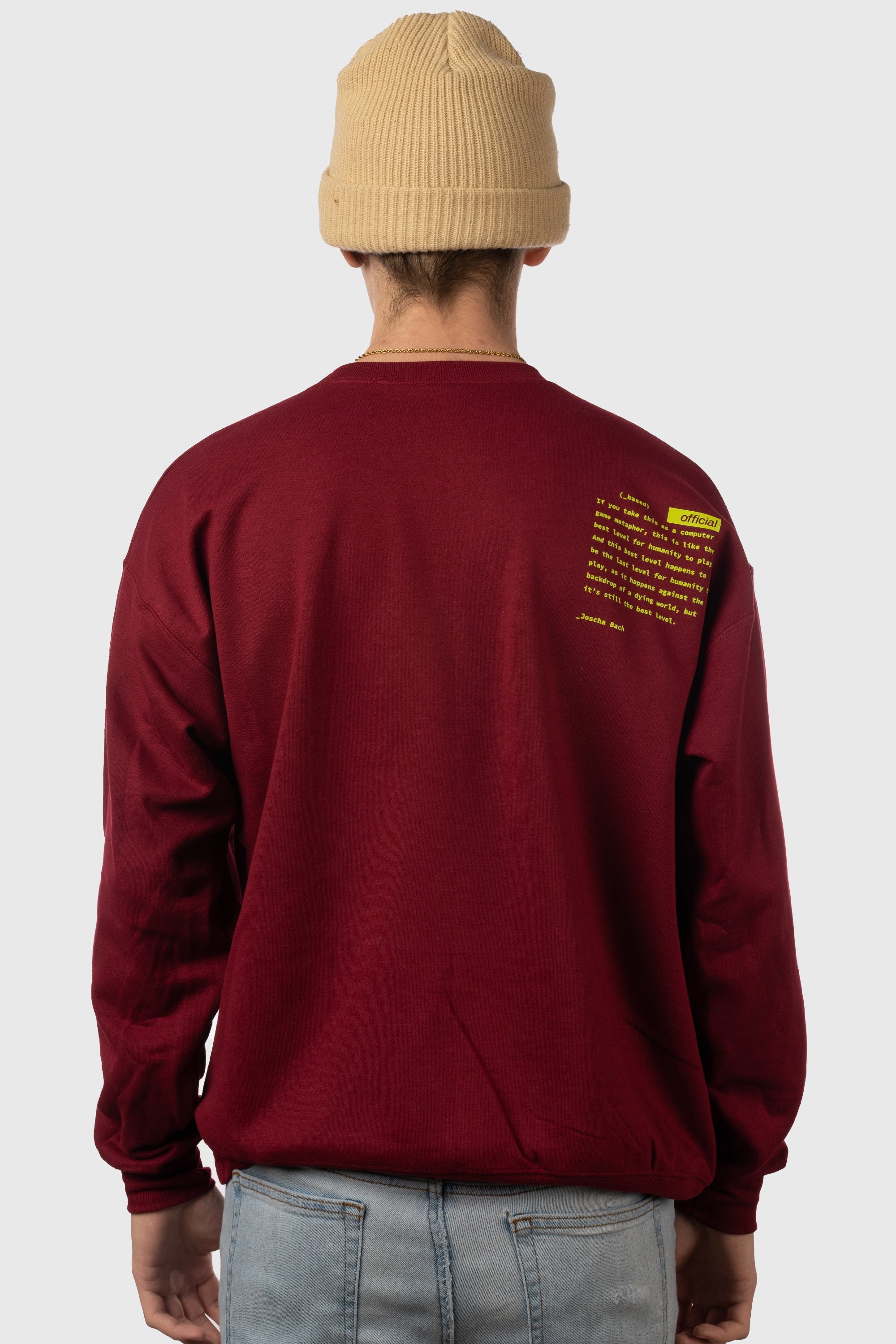 We popped this perfectly cut burgundy crewneck with a Volt print on the chest, right blade and sleeve. Study the history of the future in an Official crewneck.