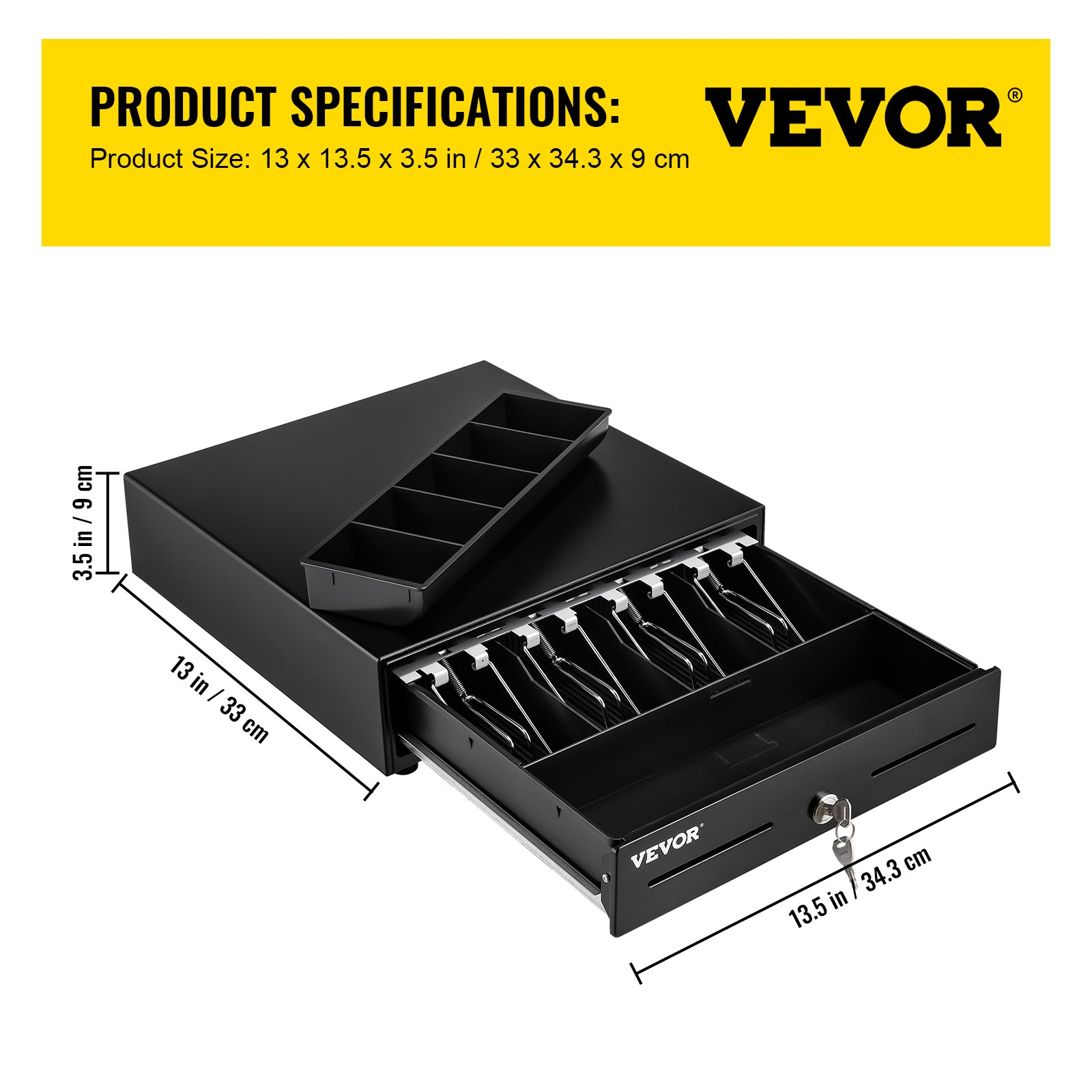 PRODUCT DESCRIPTION VEVOR Cash Register Drawer, 13" 2 Unlocking Ways, Fully Removable Design with 4 Bill 5 Coin Cash Tray, 2 Keys Included, Compact Size Cash Registers for Supermarket, Bar, Coffee Shop, Restaurant