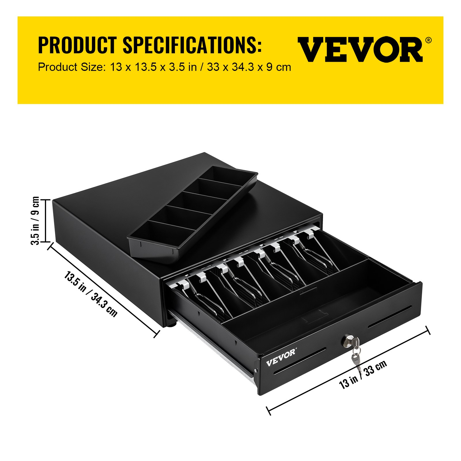 (FINAL PRICES ARE LOWER ON OUR SITE!) VEVOR Cash Register Drawer, 13" 2 Unlocking Ways, Fully Removable Design with 4 Bill 5 Coin Cash Tray, 2 Keys Included, Compact Size Cash Registers for Supermarket, Bar, Coffee Shop, Restaurant
