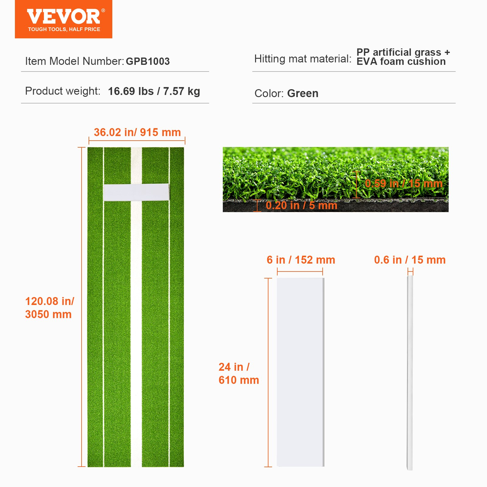 EVA Foam Cushion Thickness: 0.20 inches / 5mm,Color: Green,Item Model Number: GPB1003,Product Weight: 16.69 lbs / 7.57 kg,Product Unfolded Dimensions: 120.08x36.02x0.79 inches / 3050x915x20 mm,Hitting Mat Material: PP Artificial Grass + EVA Foam Cushion